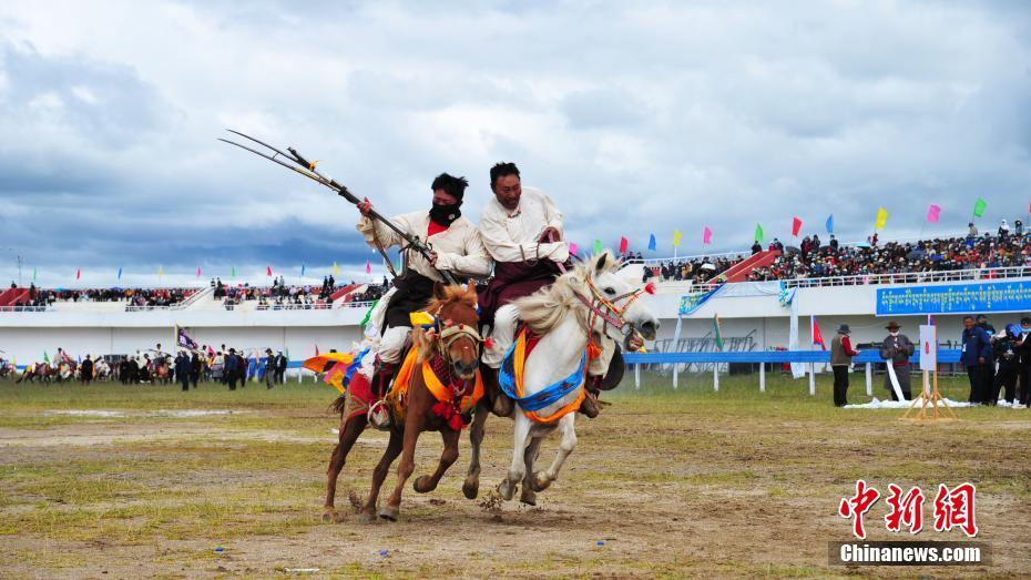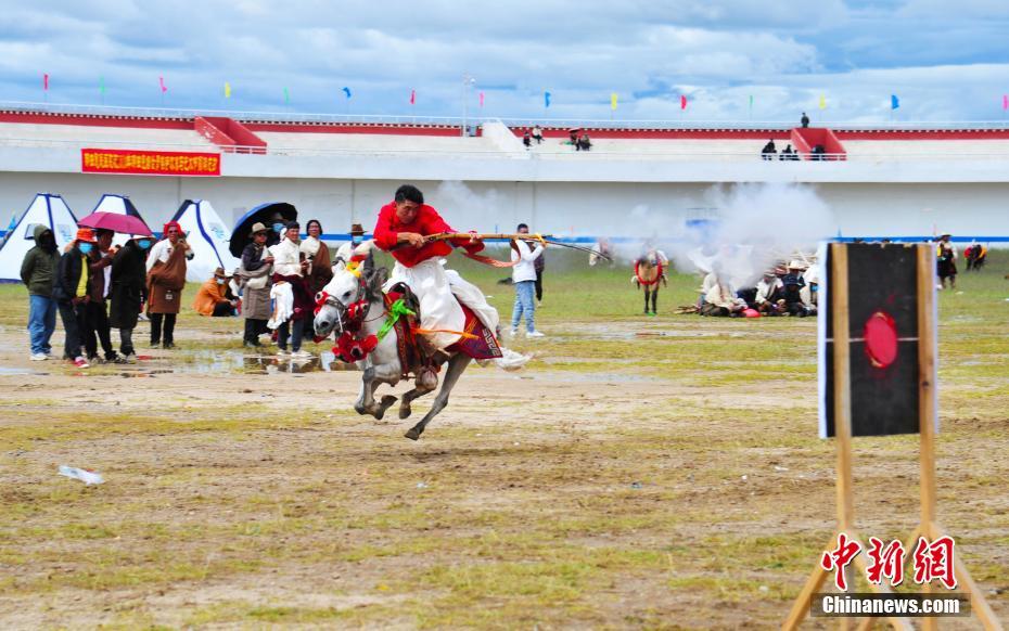 8月11日,藏北騎手表演跑馬射擊。8月10日,2020年那曲羌塘恰青格薩爾賽馬藝術(shù)節(jié)在西藏那曲市開幕。中新社記者 張偉 攝