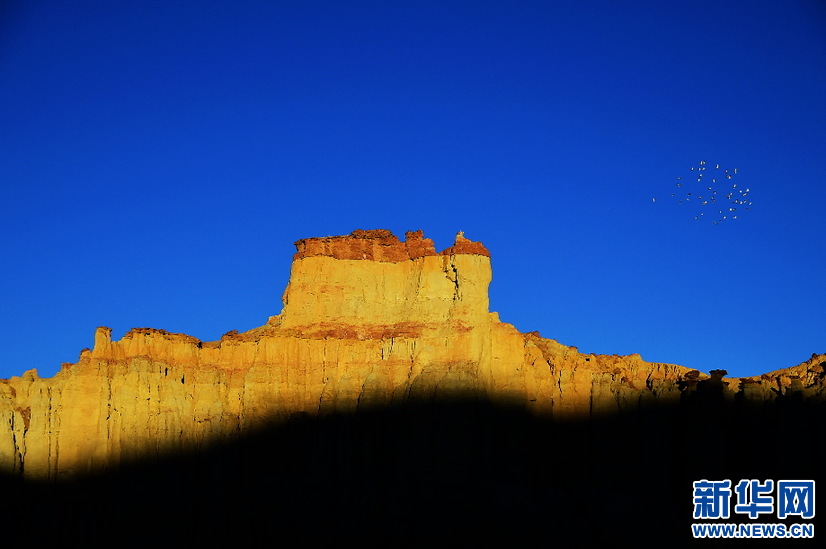 一群鳥兒飛過朝陽照耀下的土林(10月17日攝)。新華網(wǎng) 張宸攝