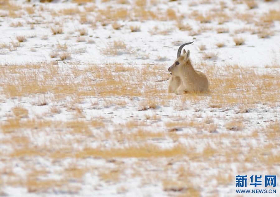 一只藏原羚在藏北高原的雪地上休憩(1月16日攝)。新華社記者 張汝鋒 攝