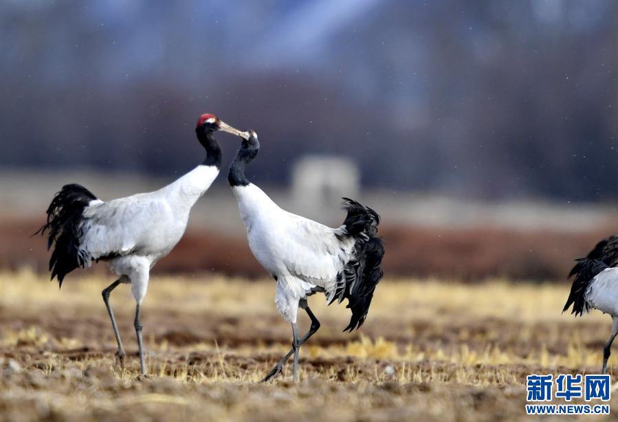 在林周縣黑頸鶴自然保護區(qū)里拍攝的黑頸鶴(3月14日攝)。新華社記者 張汝鋒 攝