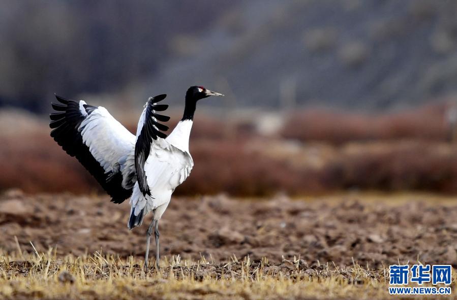 一只黑頸鶴在林周縣的農(nóng)田里起舞(3月14日攝)。新華社記者 張汝鋒 攝
