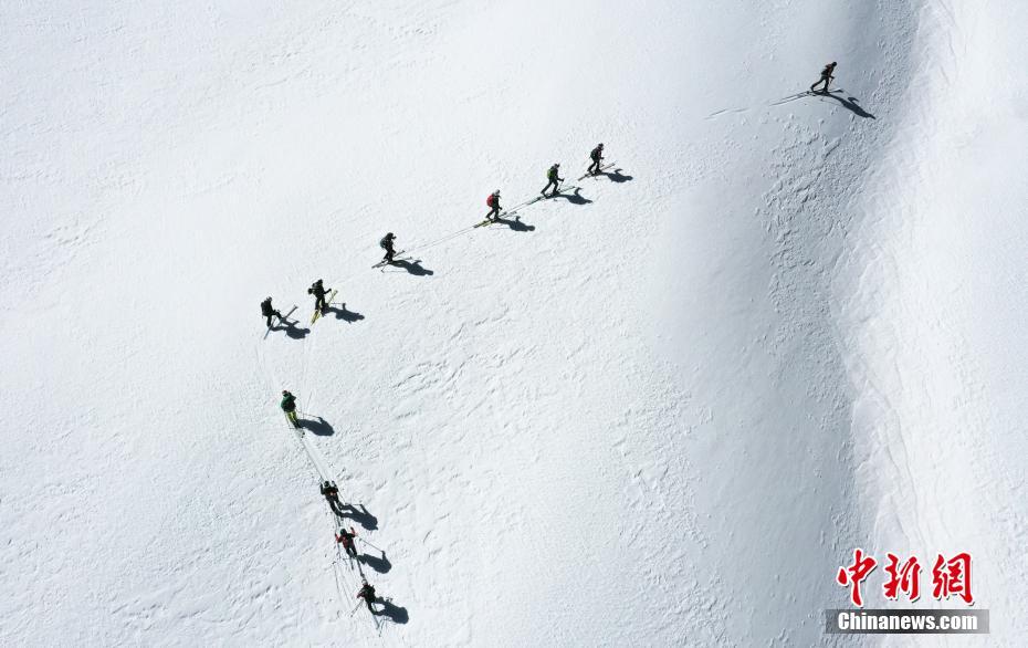 西藏拉薩河谷1號(hào)冰川(廓瓊崗日冰川)景區(qū)將與2021年4月正式全面開放,洛堆峰雪山攀登項(xiàng)目也將正式啟動(dòng)。資料圖為登山愛好者攀登洛堆峰。(無人機(jī)拍攝)中新社發(fā) 貢嘎來松 攝