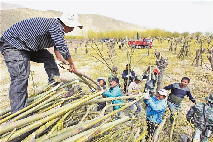 圖為拉薩市曲水縣才納鄉(xiāng)納木村村民正在整理樹(shù)苗。