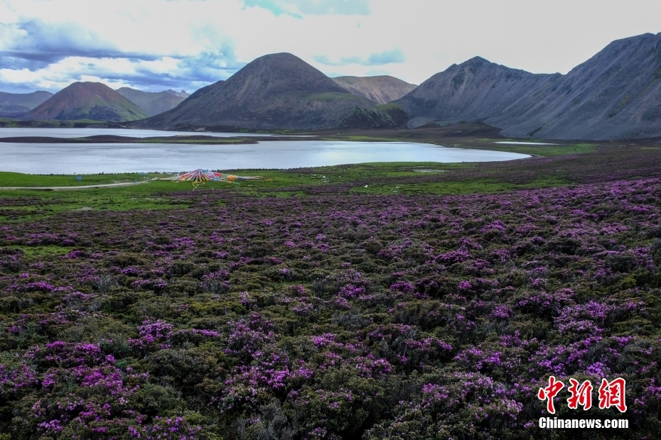 6月23日,思金拉措湖畔紫色鮮花盛開,景色秀麗。思金拉措位于西藏墨竹工卡縣日多鄉(xiāng),海拔4500多米,周邊群峰簇?fù)?,地形猶如聚寶盤,不少民眾將其稱為西藏的“財(cái)神湖”。 中新社記者 江飛波 攝