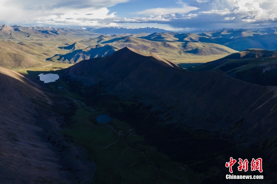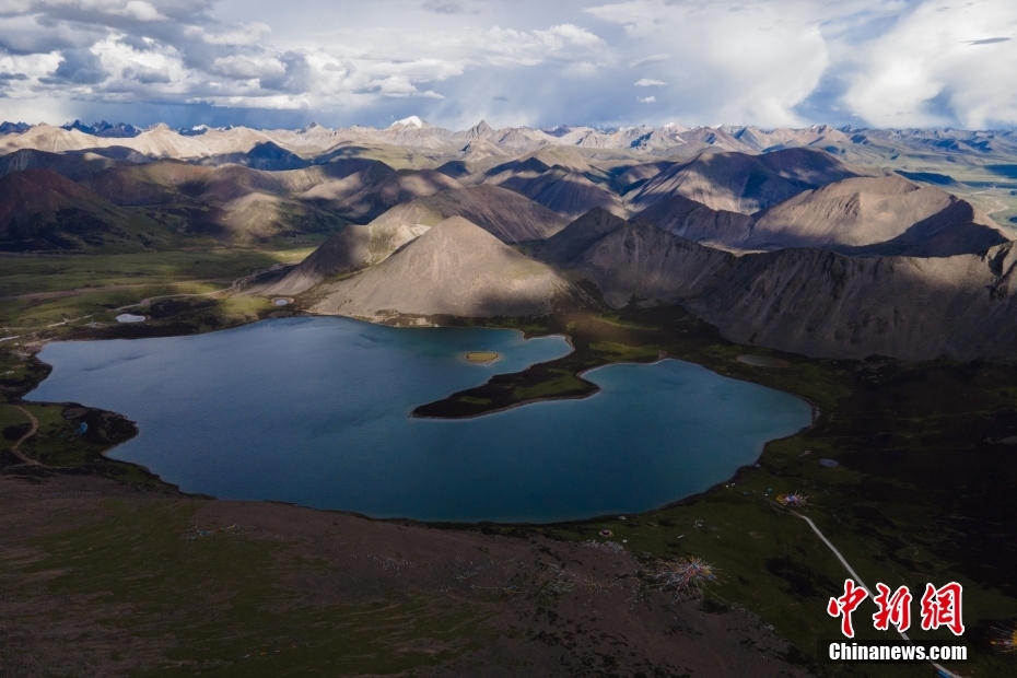 6月23日,思金拉措湖邊高原山脈風(fēng)光。思金拉措位于西藏墨竹工卡縣日多鄉(xiāng),海拔4500多米,周邊群峰簇?fù)恚匦为q如聚寶盤,不少民眾將其稱為西藏的“財(cái)神湖”。(無人機(jī)照片) 中新社記者 江飛波 攝