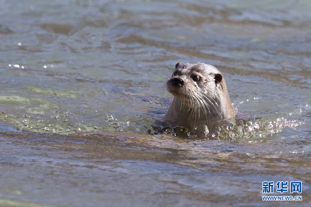 一只歐亞水獺在水中游動。新華網(wǎng)發(fā)(文德 攝)
