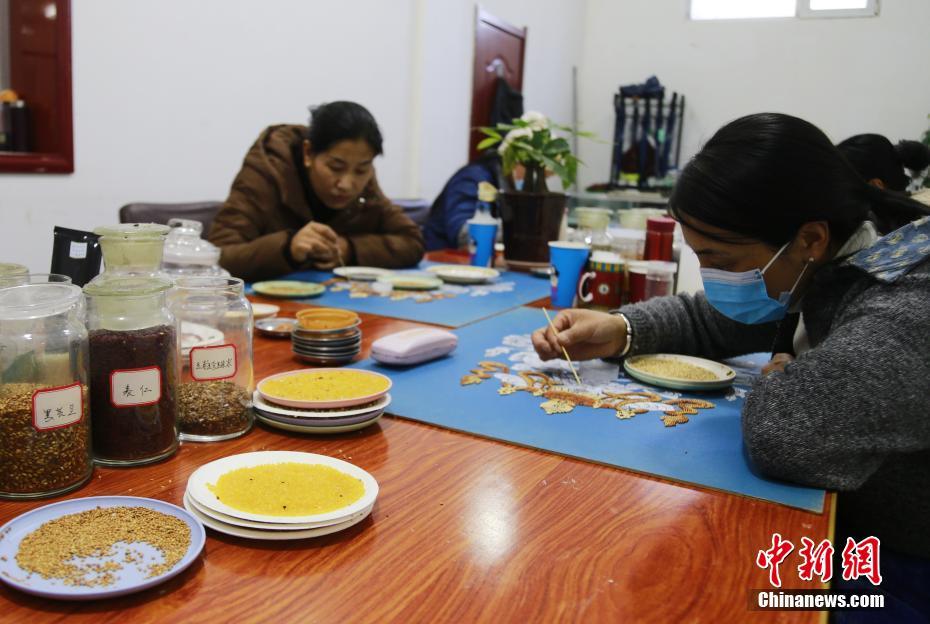 12月8日,青海省黃南藏族自治州尖扎縣,藏族婦女們用五谷作畫,秀指尖技藝。青稞、小麥、各式油菜籽等農(nóng)作物經(jīng)挑選、排列組合,“變身”精美的“尖扎五谷畫”。 中新社記者 馬銘言 攝