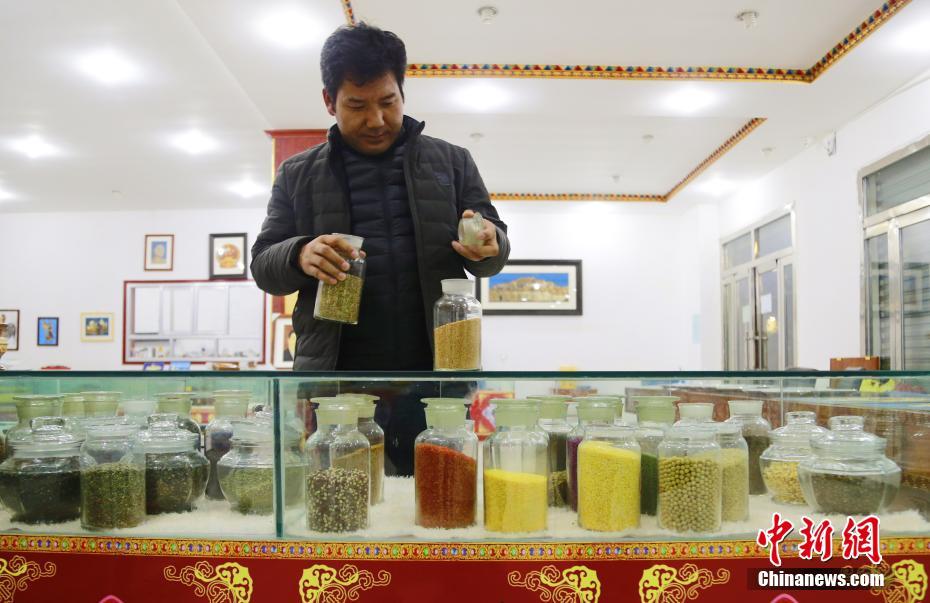 12月8日,青海省黃南藏族自治州尖扎縣,五谷畫藝人索南本查看農(nóng)作物儲存狀況。青稞、小麥、各式油菜籽等農(nóng)作物經(jīng)挑選、排列組合,“變身”精美的“尖扎五谷畫”。2007年,該縣藝人索南本開始創(chuàng)作藏式風(fēng)格五谷畫,摸索防臭、防蟲、防潮、裝裱等步驟,并在當(dāng)?shù)亻_展培訓(xùn),帶領(lǐng)殘疾、困難民眾進(jìn)行創(chuàng)作,憑雙手致富。 中新社記者 馬銘言 攝