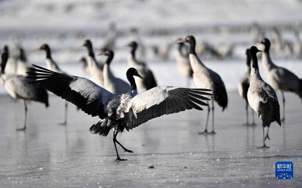 西藏黑頸鶴踏雪飛春