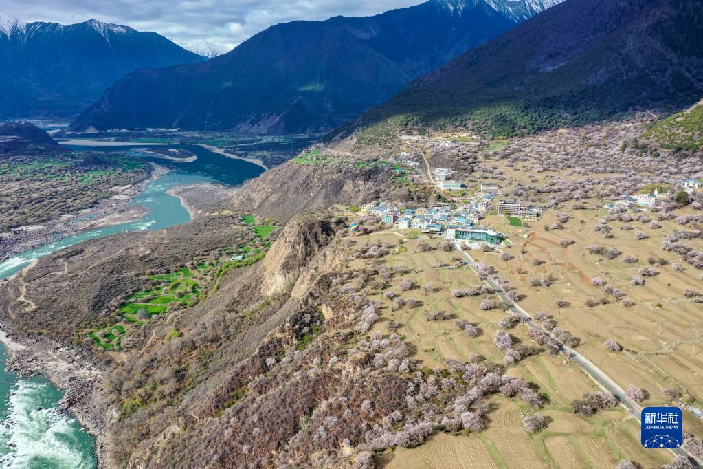 這是無人機(jī)拍攝的索松村,村子腳下是蜿蜒的雅魯藏布江(4月13日攝)。新華社記者 孫非 攝