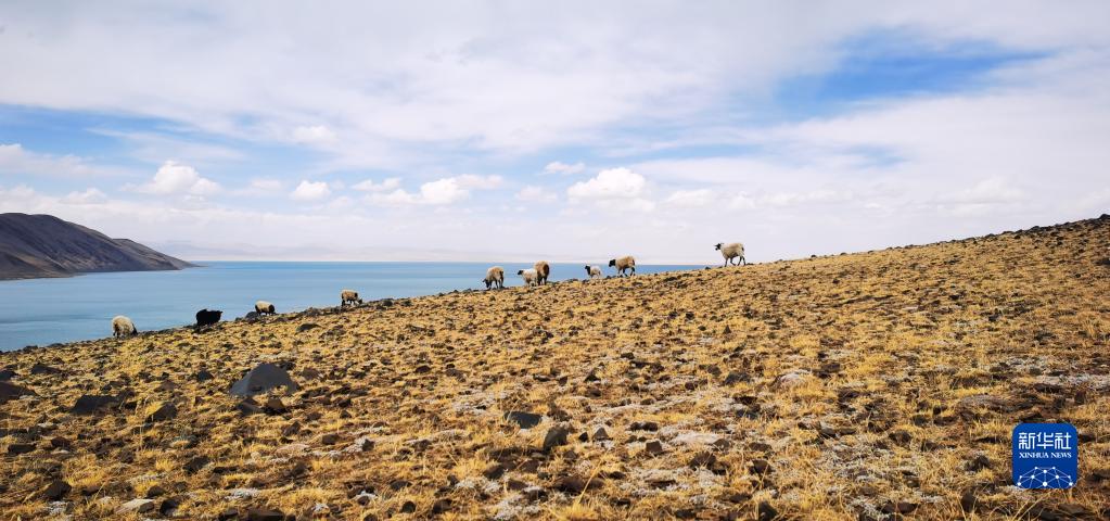 在位于西藏自治區(qū)那曲市的巴木錯,羊群在湖邊吃草(2022年4月13日攝,手機照片)。新華社記者 沈虹冰 攝