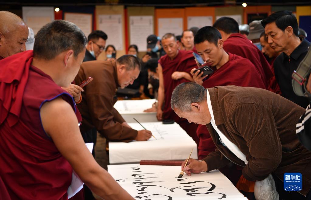 4月28日,拉薩大昭寺僧人與書(shū)法家切磋技藝。新華社記者 覺(jué)果 攝