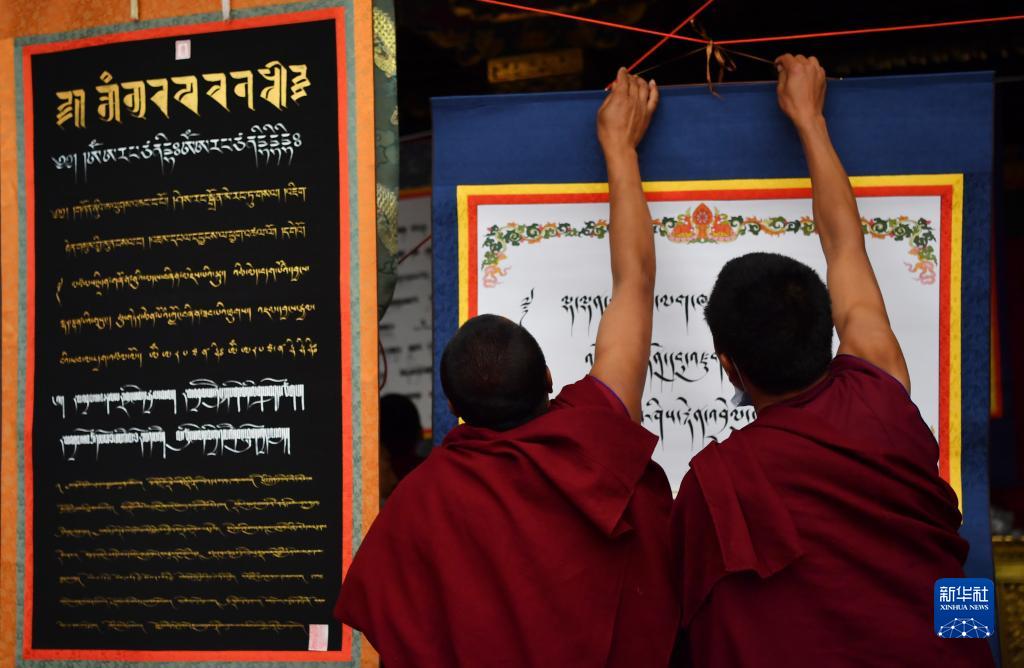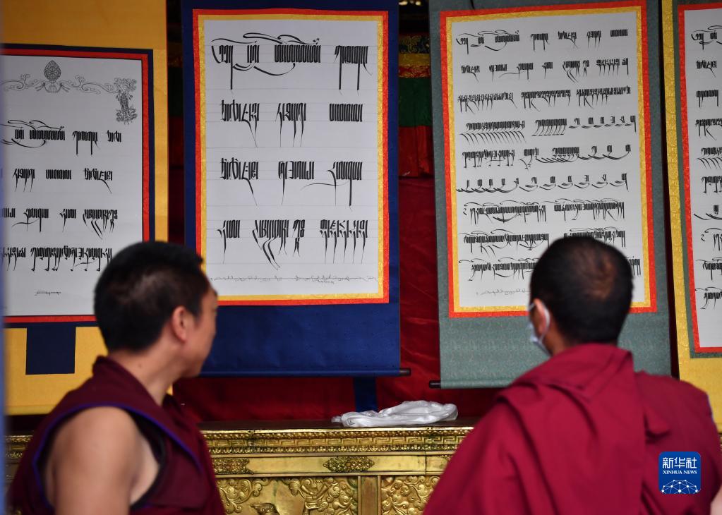 當(dāng)天,西藏拉薩大昭寺舉行第三屆藏文書(shū)法展。50多名僧人創(chuàng)作的120多幅藏文書(shū)法作品,展示了不同字體書(shū)寫(xiě)的藏文之美。