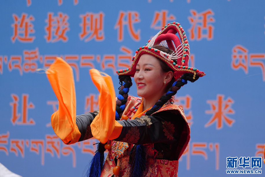 6月11日,西藏山南市貢嘎縣吉瓊村文藝演出隊(duì)在表演舞蹈《魯古百瓊》。新華網(wǎng) 旦增努布攝