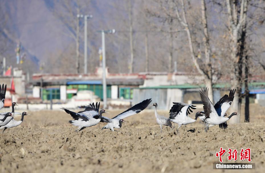 每年的10月底,成群的黑頸鶴飛到西藏拉薩市林周縣越冬,在拉薩市林周縣周邊的湖泊濕地度過5個(gè)月的“閑云野鶴”生活,次年三四月份再飛向藏北草原繁殖。黑頸鶴是世界上唯一一種高原鶴類。具有足長、喙長、頸長的典型涉禽類特征,適合在沼澤地里行走。黑頸鶴的頸、尾為黑色,體羽為灰白色。黑頸鶴是國家一級保護(hù)動(dòng)物。目前,每年到林周縣越冬的黑頸鶴已達(dá)2000只左右。圖為黑頸鶴在林周境內(nèi)的農(nóng)田上空飛翔。 貢嘎來松 攝