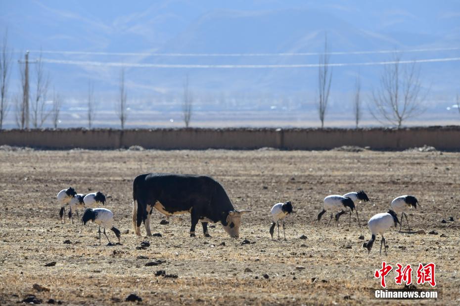 每年的10月底,成群的黑頸鶴飛到西藏拉薩市林周縣越冬,在拉薩市林周縣周邊的湖泊濕地度過5個(gè)月的“閑云野鶴”生活,次年三四月份再飛向藏北草原繁殖。黑頸鶴是世界上唯一一種高原鶴類。具有足長、喙長、頸長的典型涉禽類特征,適合在沼澤地里行走。黑頸鶴的頸、尾為黑色,體羽為灰白色。黑頸鶴是國家一級保護(hù)動(dòng)物。目前,每年到林周縣越冬的黑頸鶴已達(dá)2000只左右。圖為黑頸鶴在林周境內(nèi)的農(nóng)田里覓食。 貢嘎來松 攝