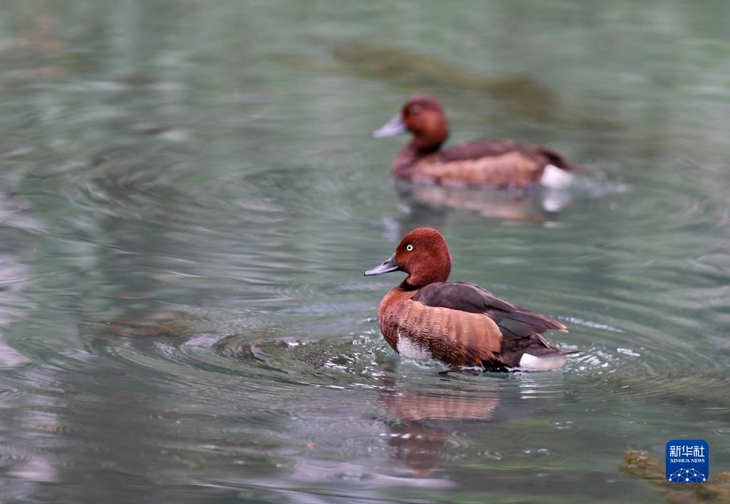 夏日里,白眼潛鴨和鳳頭潛鴨在西藏拉薩市拉魯濕地國家級(jí)自然保護(hù)區(qū)中干渠里覓食、嬉戲。