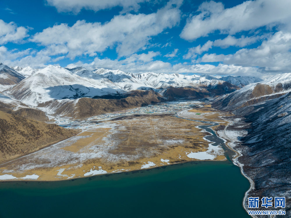嘉乃玉錯(cuò)與不遠(yuǎn)處的嘉黎縣縣城(12月10日攝,無人機(jī)照片)。新華網(wǎng) 旦增努布 攝