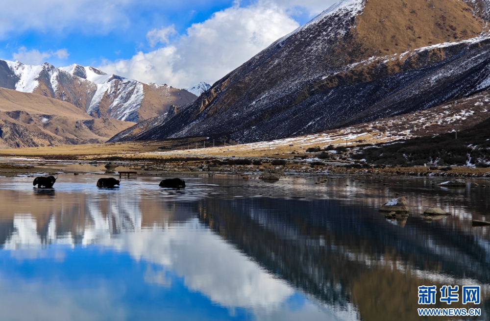 12月10日,在嘉乃玉錯(cuò)湖邊拍攝的牦牛。新華網(wǎng) 旦增努布 攝