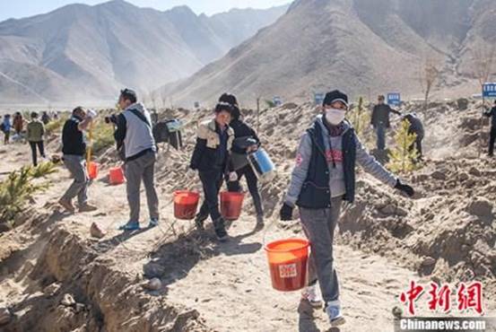 圖為西藏拉薩曲水縣才納鄉(xiāng)四季吉祥村義務(wù)植樹點志愿者們忙著提水 何蓬磊 攝