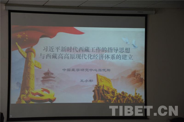 圖為王小彬作題為《習近平新時代西藏工作的指導思想與西藏高高原現代化經濟體系的建立》的報告。