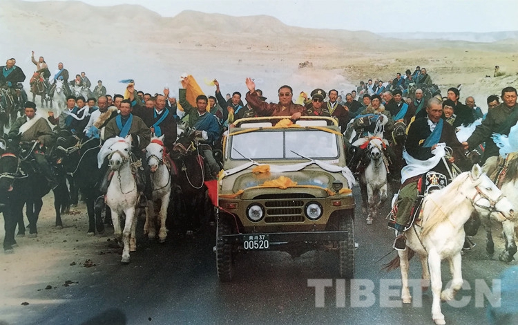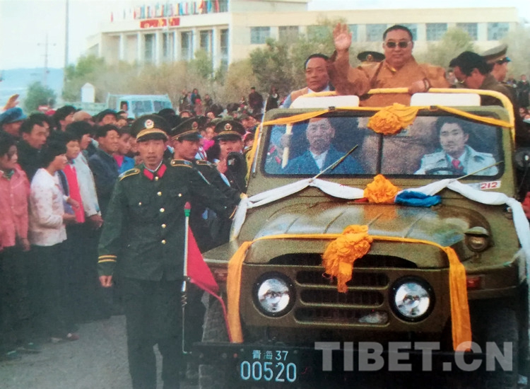 當(dāng)十世班禪大師在原青海省人大常委會(huì)副主任夏茸尕布、原海南州委書記東主加的陪同下,乘敞篷車從幸福灘來到海南州州府所在地恰卜恰鎮(zhèn)時(shí),各族人民群眾身著節(jié)日盛裝,載歌載舞,熱烈歡迎十世班禪大師。十世班禪神采奕奕,精神飽滿,高興地向各族群眾招手致意。