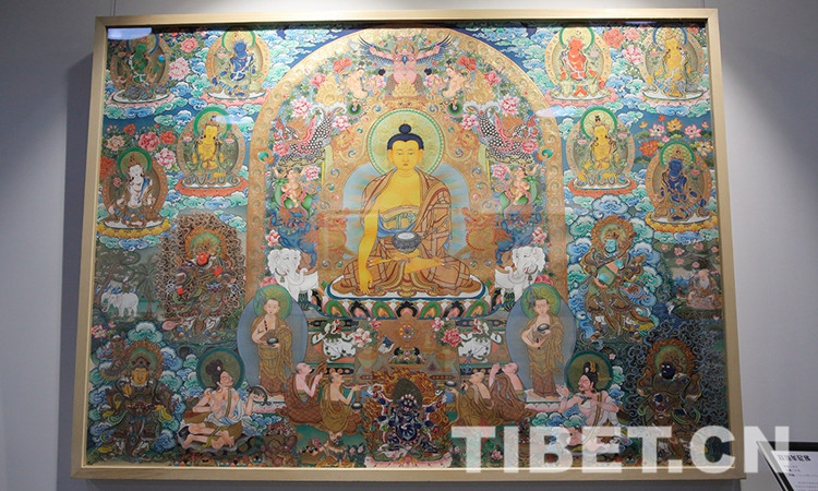 展覽共展出中國工藝美術(shù)大師、國家非物質(zhì)文化遺產(chǎn)項目代表性傳承人娘本、以及其弟子參與創(chuàng)作的唐卡作品25幅。圖為娘本唐卡作品《釋迦摩尼佛》。攝影:楊月云
