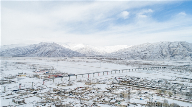 圖為拉林鐵路首座聲屏障橋梁穿過千年古鎮(zhèn)杰德秀