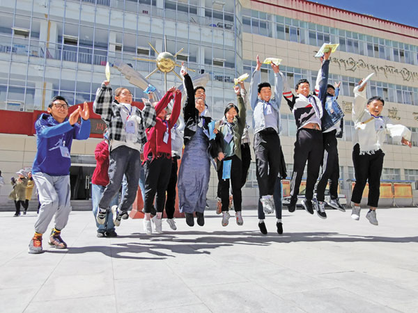 圖為結(jié)束藏語文考試的考生慶祝高考結(jié)束。來源:西藏日?qǐng)?bào) 攝影:王莉