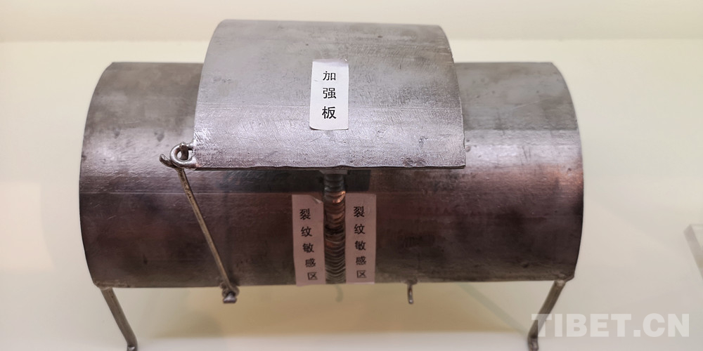圖為楊永磊設(shè)計(jì)的管道裂紋帶壓處理工藝,利用焊接應(yīng)力將裂紋逐漸收嚴(yán),增加加強(qiáng)板,防止裂紋的蔓延,省時(shí)省力省費(fèi)用,且安全可靠 攝影:李元梅