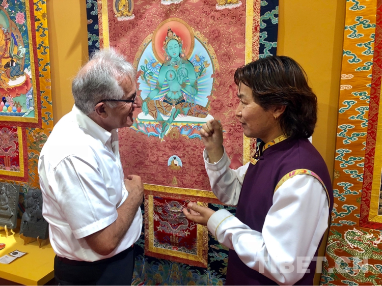 圖為國家一級作家、文化學者雪漠(左)與熱貢藝術傳承人格桑嘉措(右)在展區(qū)交流 攝影:尼知加