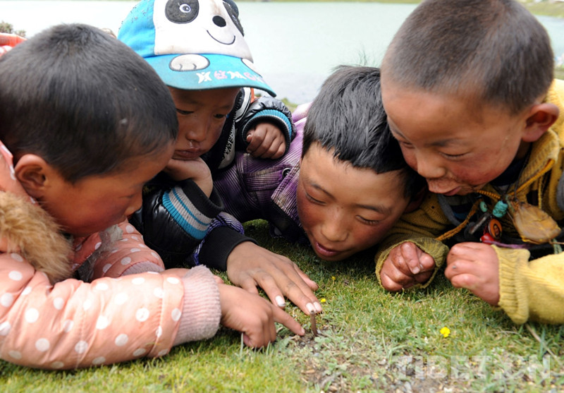 圖為藏族兒童在觀看所找到的蟲草(唐召明2014年7月10日攝)
