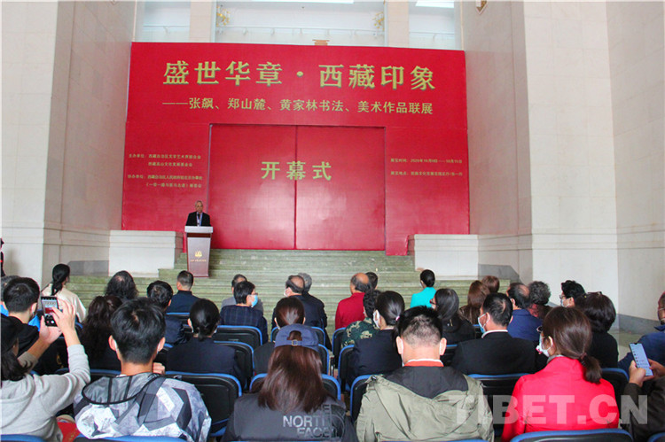 本次展覽由西藏自治區(qū)文學(xué)藝術(shù)界聯(lián)合會(huì)、西藏高山文化發(fā)展基金會(huì)主辦,西藏自治區(qū)人民政府駐北京辦事處和《一帶一路與茶馬古道》籌委會(huì)協(xié)辦,由張飆、鄭山麓、黃家林三位藝術(shù)家聯(lián)袂,以書法、詩(shī)詞、繪畫的藝術(shù)形式展現(xiàn)了在黨中央堅(jiān)強(qiáng)領(lǐng)導(dǎo)下,西藏自治區(qū)取得的巨大成就,以及西藏自治區(qū)各族人民加強(qiáng)民族團(tuán)結(jié)、建設(shè)美麗西藏的生動(dòng)實(shí)踐。同時(shí),本次展覽展品中還包括了記錄醫(yī)護(hù)工作者抗擊新冠肺炎疫情的優(yōu)秀作品。在上百件展品中,張飆創(chuàng)作的反映西藏自治區(qū)經(jīng)濟(jì)社會(huì)發(fā)展成就的詩(shī)詞、書法,鄭山麓創(chuàng)作的呈現(xiàn)西藏自治區(qū)舞蹈藝術(shù)魅力的60米國(guó)畫長(zhǎng)卷《甲諧舞吉祥之盛世歡歌》,以及黃家林以布達(dá)拉宮為主題創(chuàng)作的油畫作品是展覽的亮點(diǎn),吸引觀眾紛紛駐足。