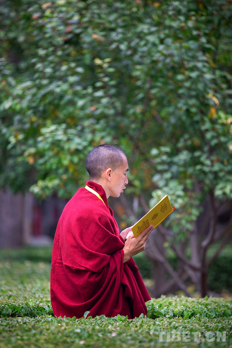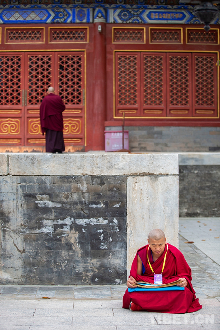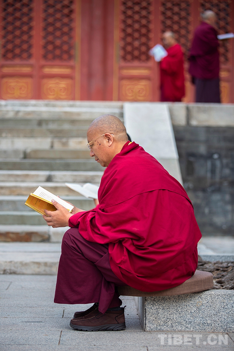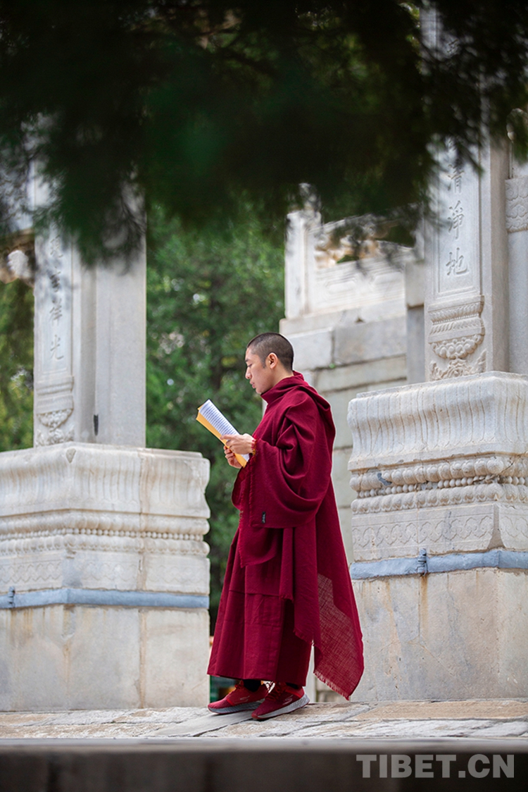 中國西藏網(wǎng)訊 10月29日,深秋的清晨,位于北京西黃寺的中國藏語系高級佛學(xué)院內(nèi),古柏蒼蒼,清凈肅穆。還有半個小時,2020年藏傳佛教第十六屆“拓然巴”高級學(xué)銜畢業(yè)考試辯經(jīng)考試就將準(zhǔn)時開始。等待參加辯經(jīng)考試的學(xué)僧們,正在西黃寺大殿前誦經(jīng),抓緊時間為考試進行最后的準(zhǔn)備。大家或席地而坐,或立定一隅,或踱步前行,梵唱聲聲,余音繞梁。(中國西藏網(wǎng) 攝影/許娜 編輯/周晶)