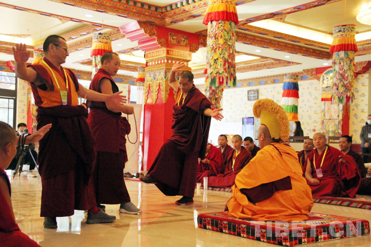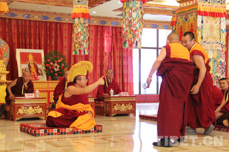 被主考官點(diǎn)名上場(chǎng)的考僧,身披黃色法衣,結(jié)跏趺坐于考場(chǎng)正中佛墊,屏氣凝神。提問(wèn)辯經(jīng)人員用“諦……”聲提示“舌戰(zhàn)”開(kāi)始,并在考場(chǎng)上來(lái)回走動(dòng)間口若懸河、滔滔不絕,即興向考僧提問(wèn)。提問(wèn)過(guò)程中,辯經(jīng)人員常會(huì)借助各種手勢(shì)來(lái)增強(qiáng)辯論的力度。如右手甩念珠,快速跨步向前,高舉右手,用力擊掌,聲如裂石,令人振奮??忌仨毤芯?,意志堅(jiān)定,沉著應(yīng)戰(zhàn)。不得不說(shuō),雙方常會(huì)言辭激烈,爭(zhēng)辯得面紅耳赤,這種情況下,仍能夠從容不迫、應(yīng)答得體的佼佼者才能得到認(rèn)可,脫穎而出。