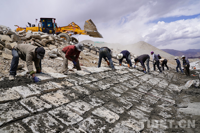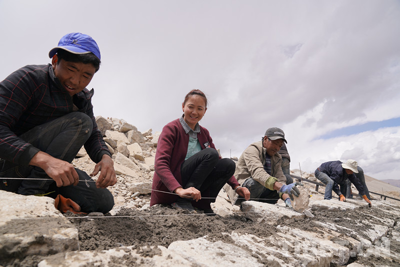 圖為農(nóng)民工施工聯(lián)隊(duì)長(zhǎng)洛桑白珍(左二)與農(nóng)民工一起干活