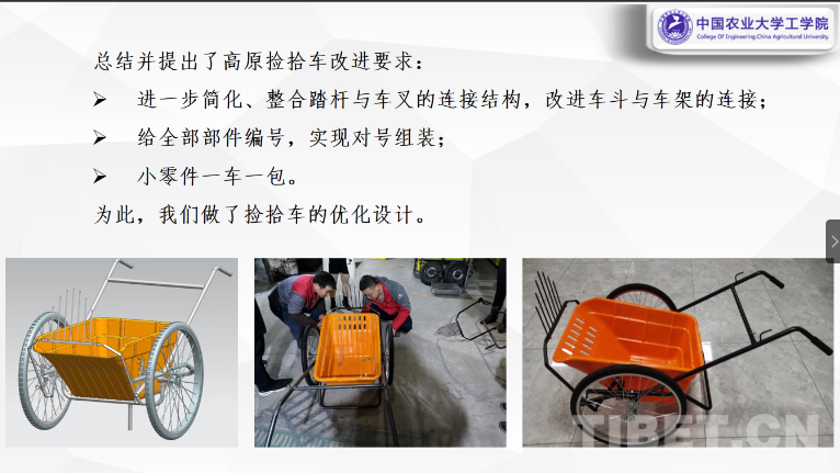 啟動(dòng)會(huì)上,高原撿拾車(chē)研發(fā)首席專(zhuān)家中國(guó)農(nóng)業(yè)大學(xué)工學(xué)院教授王光輝介紹了高原撿拾車(chē)最新改版的情況。他表示,針對(duì)過(guò)去推廣中發(fā)現(xiàn)的個(gè)別問(wèn)題,對(duì)車(chē)子進(jìn)行了優(yōu)化設(shè)計(jì),去掉了易發(fā)生損壞的控叉線(xiàn)閘,調(diào)整了車(chē)身的踏桿與車(chē)叉的連接結(jié)構(gòu),改進(jìn)車(chē)斗與車(chē)架的連接,做到了對(duì)號(hào)組裝和小零件一車(chē)一包等,使安裝更加便捷、使用更加方便、車(chē)子更加堅(jiān)固。