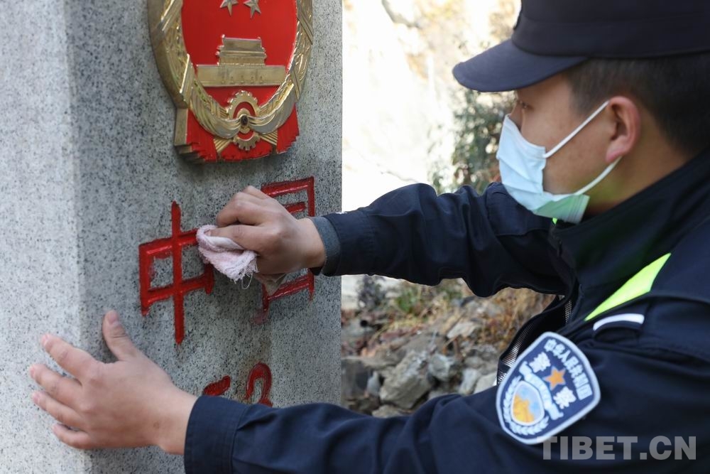圖為執(zhí)勤點(diǎn)民警為神圣的界碑描紅 攝影:鄒興國