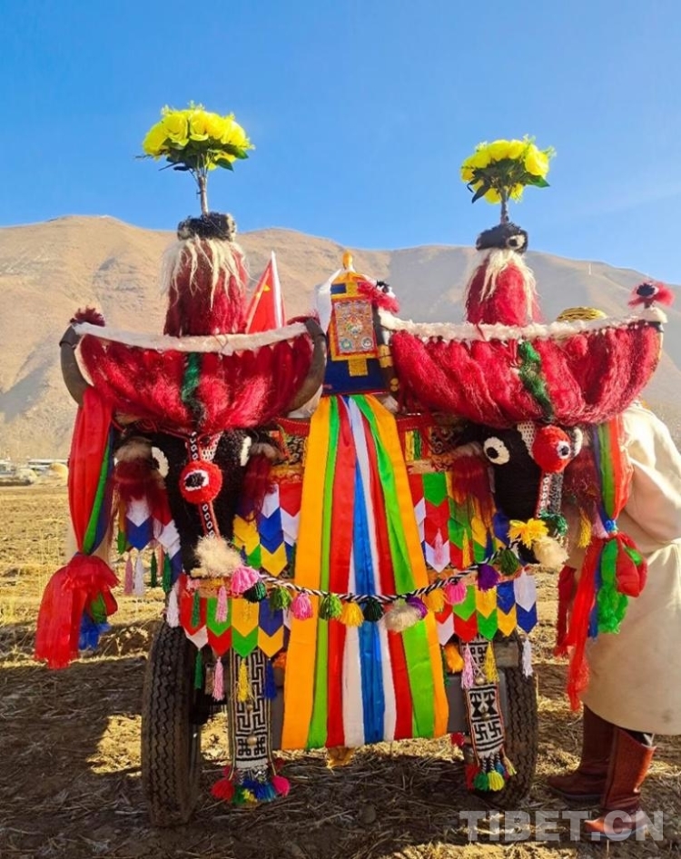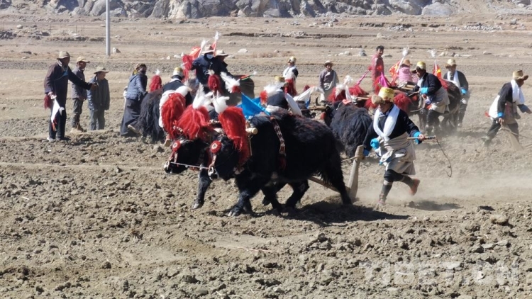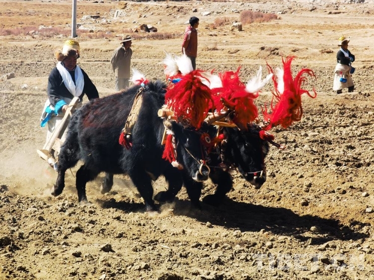 在日喀則市南木林縣嘎布村,鄉(xiāng)野間鈴鐺聲響個不停。梳洗毛發(fā)、掛上紅色的穗子,拿出犁頭、喂牛吃糌粑……春耕儀式即將開始,“二牛抬杠”的傳統(tǒng)依舊在這里保存。手持鞭子,身著盛裝的男子在地里驅(qū)趕著兩頭耕牛向前奔跑,翻出的泥土揚起陣陣塵土。吆喝聲伴著鈴鐺聲,還有周圍的歡笑聲,讓這里異常熱鬧。
