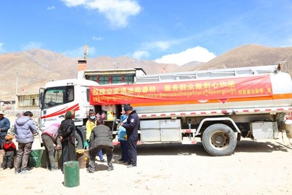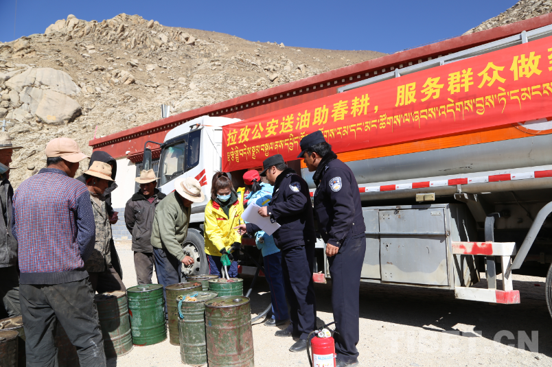 因拉孜縣彭措林鄉(xiāng)、扎西崗鄉(xiāng)地處偏遠(yuǎn),村民購買柴油困難,拉孜縣公安局及時與相關(guān)部門和中國石油拉孜分公司溝通協(xié)調(diào),適時掌握群眾用油需求,成立了拉孜公安送油小分隊(duì),指派專職民警跟著油車送油助春耕,將便民、惠農(nóng)服務(wù)延伸到田間地頭,讓群眾不出村就可以加到放心的柴油。
