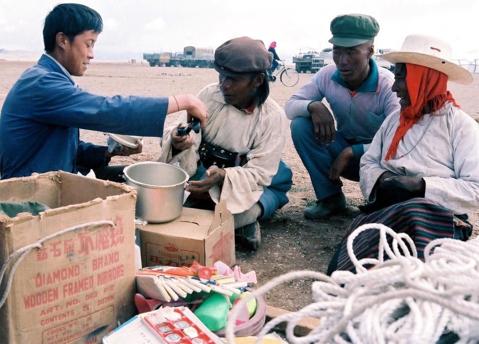 圖為在文部辦事處(現(xiàn)改為尼瑪縣)賽馬會(huì)上,如“候鳥”一樣飛來飛去的漢族商販在經(jīng)營小商品(唐召明1987年攝)