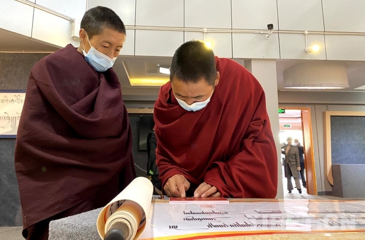 圖為2021年5月,“同心共筑中國夢”——西藏僧尼群眾書法精品展現(xiàn)場,僧尼正在觀看展現(xiàn)了烏金體、朱匝體等20余種風(fēng)格迥異的藏文書法體系的書法作品《藏文字體大全》 攝影:王媛媛