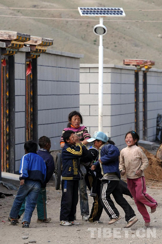 這是雙湖特別區(qū)(現(xiàn)為雙湖縣)嘎措鄉(xiāng)幾名兒童在中國(guó)石油所援建安居新房的太陽(yáng)能燈柱下玩耍(唐召明2009年攝)