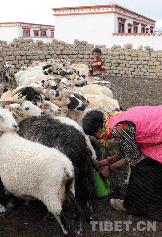 這是尼瑪縣俄久鄉(xiāng)牧民俄賽在擠羊奶。她身后是中國(guó)海油為牧民群眾所援建的安居新房(唐召明2009年攝)
