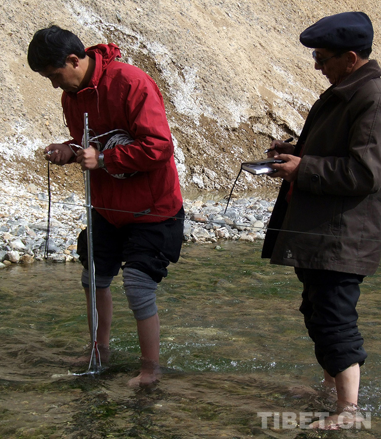 這是時(shí)任雙湖特別區(qū)副區(qū)長(zhǎng)王暉(左)和區(qū)委書(shū)記珠巨(右)在測(cè)量建設(shè)中的水電站流速(王暉提供,2007年攝)