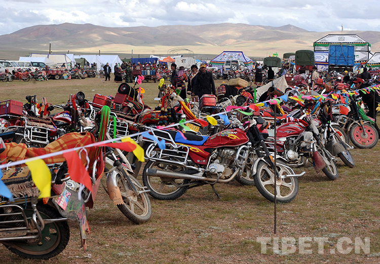 這是在雙湖“撤區(qū)建縣”慶?;顒?dòng)上,許多牧民騎著自家摩托車遠(yuǎn)道而來(lái)(唐召明2013年7月26日攝)