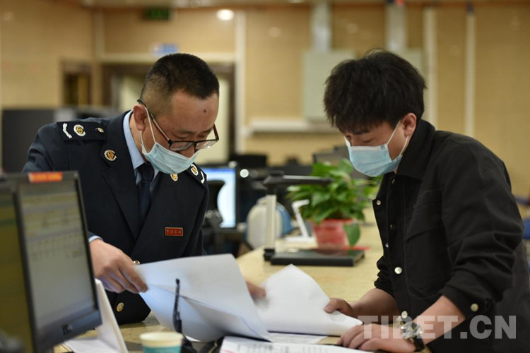 圖為西藏自治區(qū)稅務(wù)系統(tǒng)工作人員幫助納稅人辦理業(yè)務(wù)
