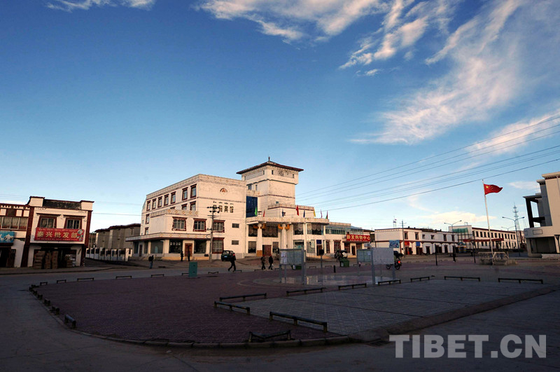 這是中國(guó)海油為尼瑪縣城援建的尼瑪賓館和新廣場(chǎng)(唐召明2009年8月8日攝)
