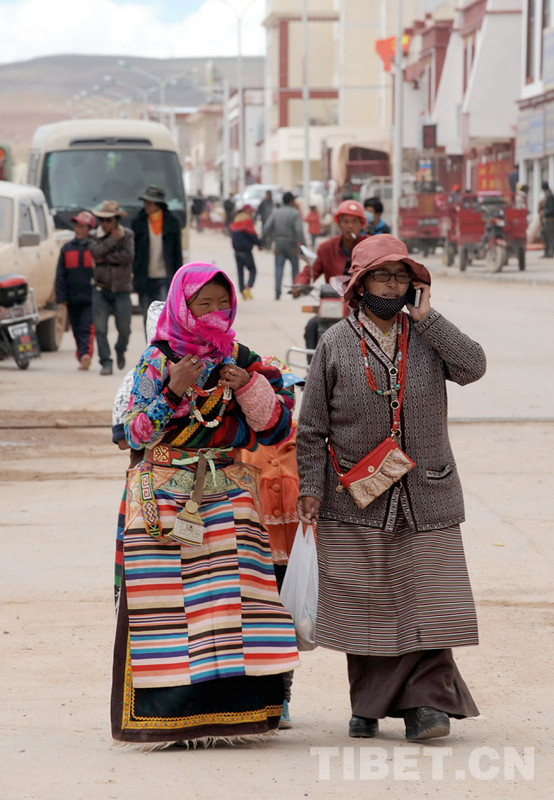 這是尼瑪縣城街頭打著手機(jī)逛街的兩位藏族婦女(唐召明2014年7月8日攝)
