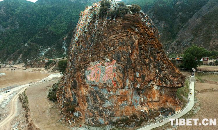 圖為江達縣崗托鎮(zhèn)崗托村,十八軍戰(zhàn)士刻下的“西藏”兩個大字 攝影:陳衛(wèi)國